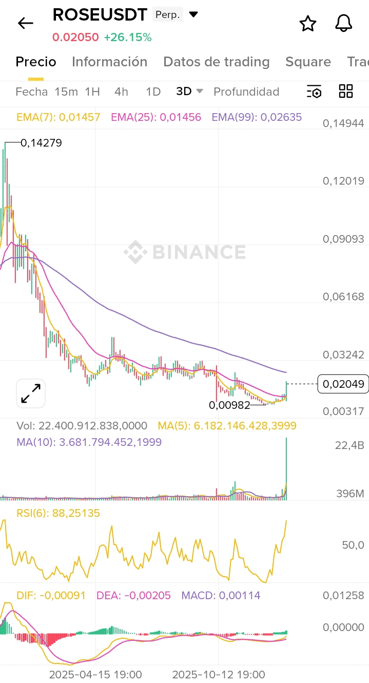 Das Bild, das du hochgeladen hast, zeigt ein Chart von Binance für ROSEUSDT Perpetual, mit einem Abwärtstrend von April 2025 (~$0.14) bis Oktober (~$0.02), jedoch mit einem kürzlichen Spike von +26.15 % zum Abschluss des Charts. Wichtige Indikatoren: