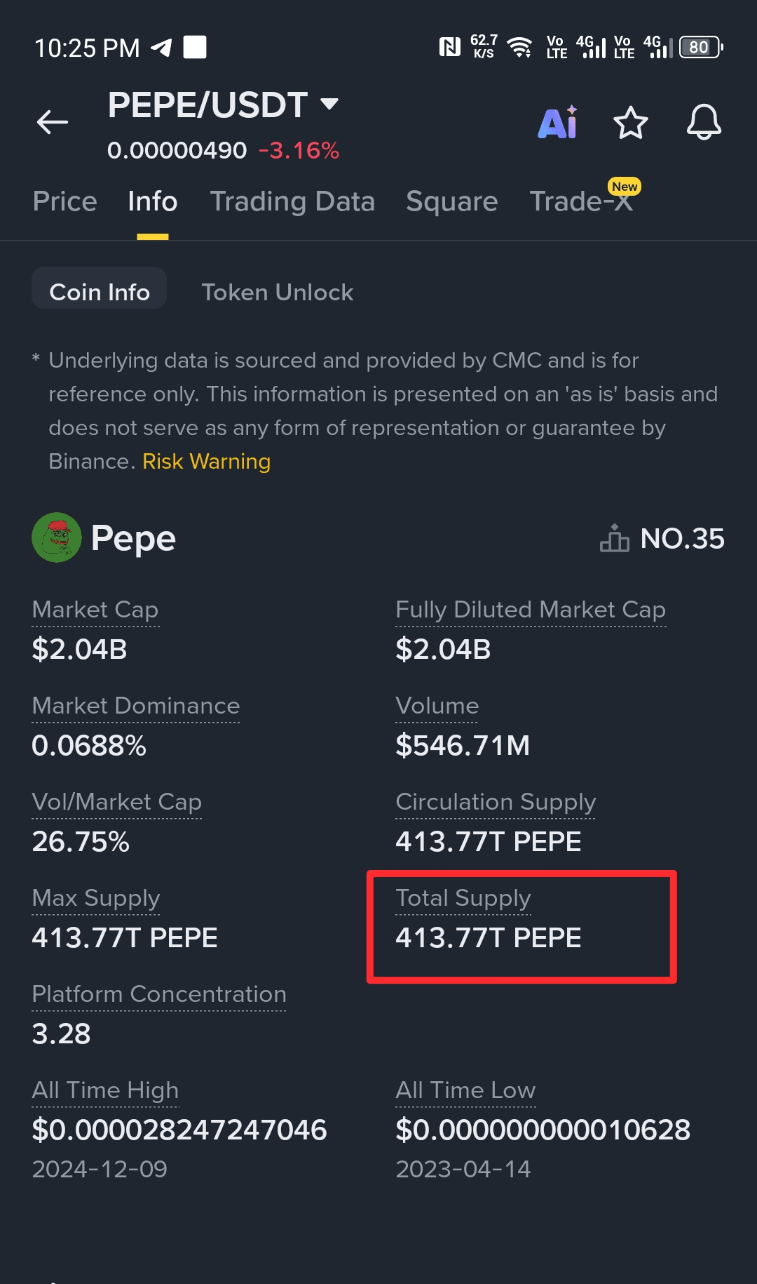 PEPE-Angebot ist mehr als 415Trillionen, also benötigt es 415 Billionen $ als Marktkapitalisierung, um den Preis auf 1 $ zu bringen, während es derzeitige Marktkapitalisierung So 1 $ fast unmöglich ist