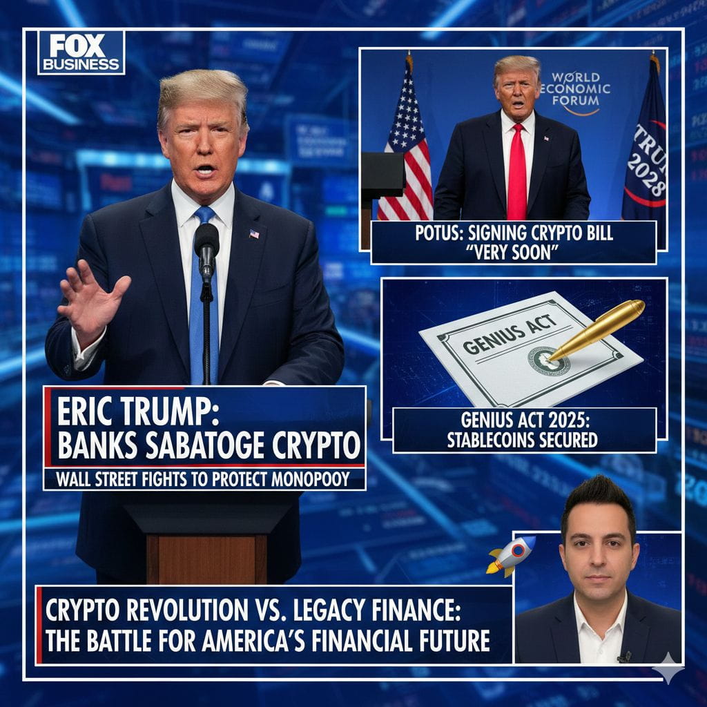Eric Trump hat gerade auf FOX Business einen Aufschrei ausgelöst und große US-Banken dafür kritisiert, dass sie versuchen, **Krypto-Gesetzgebungen zu blockieren**, die gerade durch den Kongress segeln. Er sagt, dass diese etablierten Riesen mit allen Mitteln kämpfen, weil echte Reformen ihre gemütliche Kontrolle über Zahlungen, die endlosen Abwicklungsverzögerungen und die Art und Weise, wie sie mit Kundengeldern spielen, um zusätzliches Interesse zu verdienen, gefährden würden.