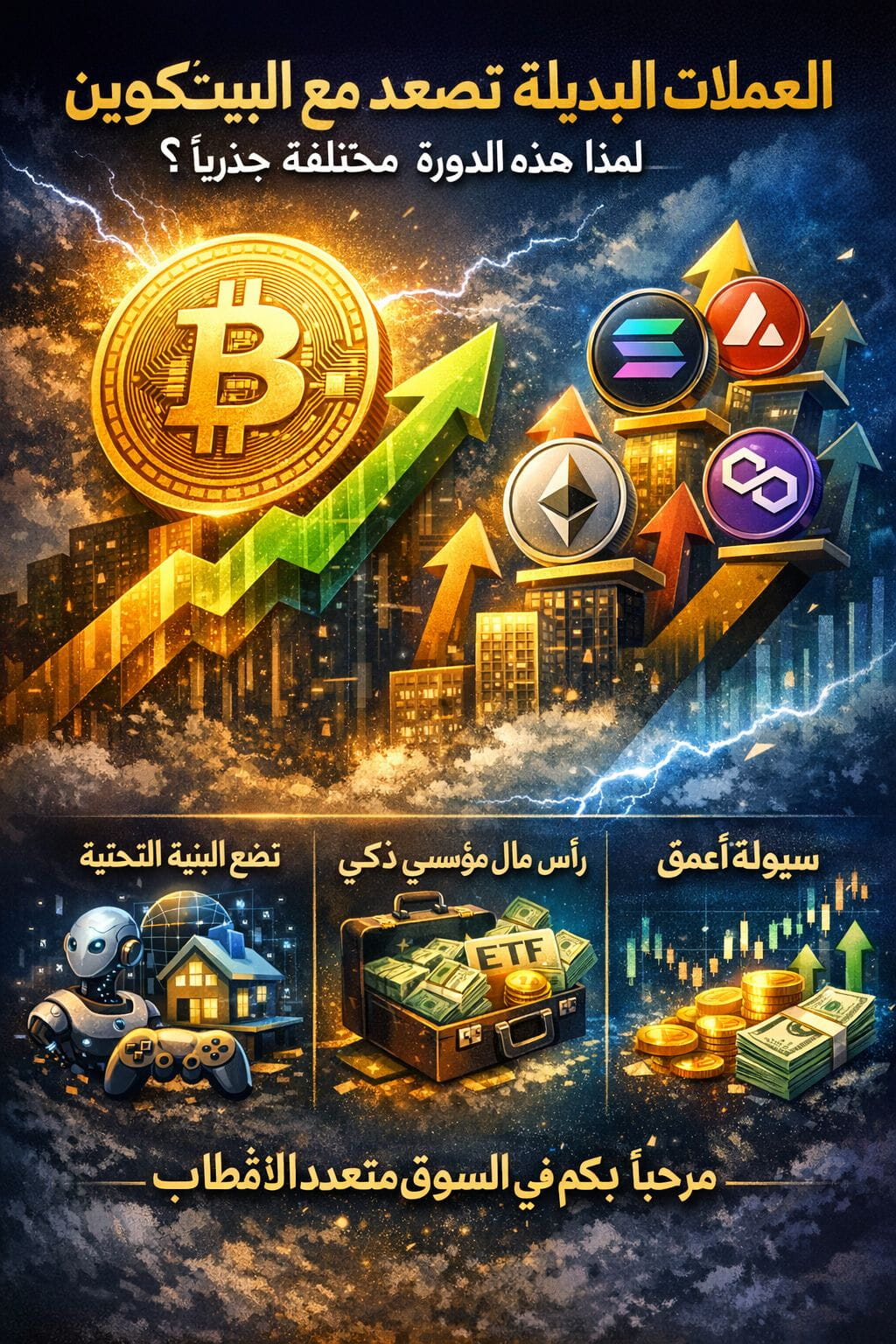 كسر القاعدة الذهبيةلعقود رقمية، كانت هناك قاعدة غير مكتوبة تحكم سوق العملات الرقمية: "أولاً يتحرك البيتكوين، ثم تتبعه العملات البديلة (Altcoins)". كان المستثمرون يراقبون مؤشر هيمنة البيتكوين (BTC Dominance) كنبوءة، منتظرين أن يستقر سعر ملك العملات ليبدأ "موسم العملات البديلة" (Altseason) الحقيقي. لكن في الدورة الحالية، يبدو أن هذه القاعدة الذهبية قد بدأت تتصدع.نحن نشهد ظاهرة جديدة ومثيرة: العملات البديلة لا تنتظر دورها بصبر، بل ترتفع بالتزامن مع البيتكوين، وأحيانًا تتفوق عليه في زخم الصعود. هذا التغير الجذري ليس صدفة، بل هو نتيجة نضج السوق وتطورات هيكلية عميقة. في هذا المقال، سنحلل الأسباب التي تجعل هذه الدورة مختلفة تمامًا عن سابقاتها.. نضج البنية التحتية وتنوع السردياتفي الدورات السابقة (2017، 2021)، كان السوق مدفوعًا بسردية واحدة مهيمنة (مثل طفرة الـ ICOs أو صعود الـ DeFi). أما اليوم، فالسوق عبارة عن نظام بيئي متعدد السرديات، كل منها يمتلك بنية تحتية ناضجة ومجتمعًا قويًا:الذكاء الاصطناعي (AI Coins): مشاريع تدمج البلوك تشين مع الذكاء الاصطناعي، مما يخلق قيمة حقيقية في مجالات مثل الحوسبة اللامركزية وتحليل البيانات.•الأصول الحقيقية المرمزة (Real World Assets - RWA): ترميز أصول من العالم الحقيقي (عقارات، سندات) على البلوك تشين، مما يفتح جسرًا بين التمويل التقليدي واللامركزي.•الـ Layer 2 وحلول التوسع: مشاريع مثل Arbitrum وOptimism وPolygon لم تعد مجرد نظريات، بل هي أنظمة بيئية حية تعالج مشكلة قابلية التوسع التي عانت منها الدورات السابقة.•الـ GameFi والميتافيرس: تطورت من مجرد أفكار إلى تجارب قابلة للعب مع اقتصادات داخلية متكاملة.•هذا التنوع يعني أن رأس المال لم يعد يتدفق فقط إلى البيتكوين، بل يتوزع مباشرة على هذه القطاعات الواعدة التي تظهر إمكانيات نمو مستقلة.. رأس المال المؤسسي أصبح أكثر ذكاءًعندما دخلت المؤسسات السوق في الماضي، كان البيتكوين هو نقطة الدخول الوحيدة الآمنة والمفهومة بالنسبة لها. اليوم، تغير الوضع. صناديق الاستثمار والمؤسسات المالية أصبحت تمتلك فرقًا متخصصة في الكريبتو، قادرة على تحليل وتقييم المشاريع البديلة الواعدة.صناديق المؤشرات المتداولة (ETFs) للبيتكوين فتحت الباب، لكنها أيضًا علّمت المؤسسات كيفية التعامل مع الأصول الرقمية. الآن، نرى استثمارات مؤسسية مباشرة في عملات بديلة قوية مثل Solana وAvalanche وغيرها، لأنها لم تعد تُعتبر مجرد "مضاربات"، بل استثمارات في بنية تحتية تكنولوجية للمستقبل.. سيولة أعمق وتأثير أقل لهيمنة البيتكوينمع نمو القيمة السوقية الإجمالية للعملات الرقمية، أصبح تأثير تحركات البيتكوين على العملات البديلة أقل حدة. في الماضي، كان أي تصحيح طفيف في سعر البيتكوين يؤدي إلى انهيار دموي في سوق العملات البديلة.اليوم، السيولة أعمق بكثير. يوجد الآن ما يكفي من رأس المال لدعم صعود البيتكوين والعملات البديلة في نفس الوقت. المستثمرون لم يعودوا مضطرين لبيع البيتكوين لشراء العملات البديلة؛ بل تتدفق أموال جديدة إلى السوق وتتجه مباشرة إلى المشاريع التي يرون فيها إمكانات نمو هائلة.الخاتمة: مرحبًا بكم في السوق متعدد الأقطابالدورة الحالية ليست مجرد تكرار للماضي. إنها تمثل انتقالًا من سوق أحادي القطب (يتمحور حول البيتكوين) إلى سوق متعدد الأقطاب، حيث يمكن لقطاعات وسرديات متعددة أن تزدهر بشكل متزامن.هذا لا يقلل من أهمية البيتكوين كمخزن للقيمة و"ذهب رقمي"، ولكنه يعترف بأن النظام البيئي للعملات الرقمية قد نضج بما يكفي ليقف على أقدامه المتعددة. لم تعد العملات البديلة مجرد "رهانات" عالية المخاطر، بل أصبحت تمثل استثمارات في مستقبل الإنترنت اللامركزي (Web3). بالنسبة للمستثمر الذكي، هذا يعني أن الفرص لم تعد تقتصر على انتظار "موسم العملات البديلة"، بل تكمن في تحديد القطاعات الرائدة التي تقود النمو الآن.