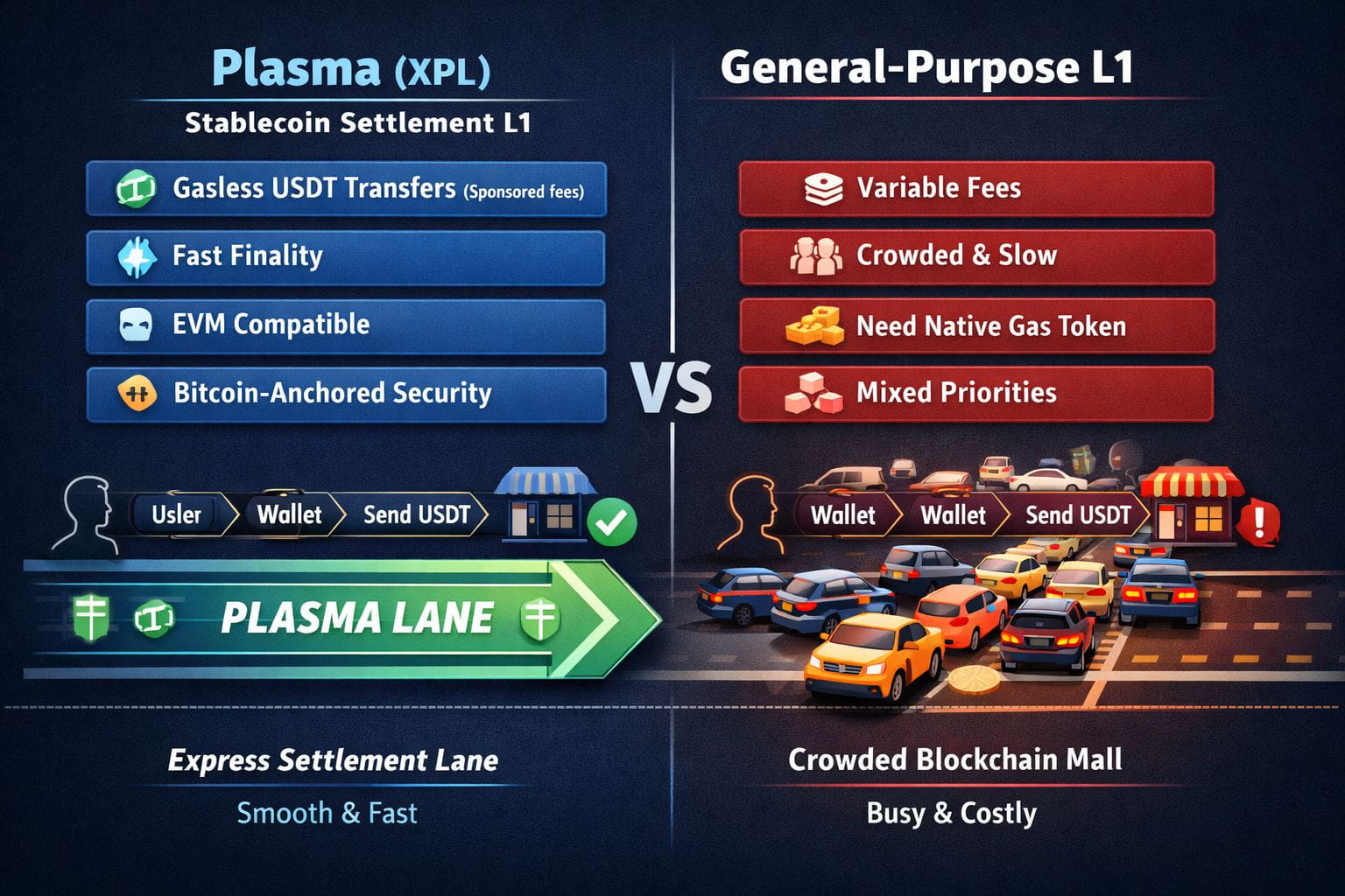 You ever try to send USDT fast… and the chain asks for a token you don’t even own? You’re at the “confirm” screen, time matters, and then - gas. That tiny moment of friction is where fintech dreams go to die. In theory, general purpose L1s are amazing. They’re like a huge mall: apps, games, DeFi, memes, everything. But money movement is not shopping. It’s more like a train schedule. People expect it to run the same way every day. If it’s late, if fees jump, if the “final” answer isn’t final… nobody building real payments can relax. That’s the core bet behind Plasma (XPL). Not “be the chain for everything.” Be the best chain for one thing: stablecoin settlement. Settlement just means the part where the payment is truly done, no take-backs, no “wait a bit more.” Fintech lives or dies on that feeling of done. Here’s why the all-in-one model keeps tripping over itself for payments. A general L1 has to serve many kinds of users at once. When activity spikes - NFT mint, meme coin rush, some hot airdrop - fees rise and blocks fill. Then simple payments get stuck behind a crowd. It’s not evil. It’s just shared space. Like trying to do a quiet bank transfer in the middle of a loud concert. And the fee token problem is real. Many chains make you hold a native token just to move a stablecoin. For a crypto-native user, fine. For a normal person? It’s weird. “Why do I need extra coins to send dollars?” That question is honest. It’s also a product killer. Finality matters too. Finality means “once the network says yes, it won’t flip to no.” Some networks have fast blocks but weaker certainty for a bit. In trading, that might be okay. In payments, it’s stress. Merchants, payroll, remittance apps… they want strong, quick certainty. Not a maybe. So Plasma leans into specialization. Plasma describes itself as an EVM-compatible Layer 1 built for stablecoins, with design choices aimed at fees, speed, and UX for stablecoin use. The EVM part just means Ethereum-style apps can run there, using the same common tools devs already know. The headline feature people feel right away is zero-fee USDT transfers for simple sends. Plasma’s docs describe a protocol-managed “paymaster” system that sponsors gas for eligible USDT transfers, so the user doesn’t need to hold XPL just to send USDT. The chain covers the fee for that one basic action, under rules meant to limit abuse. That’s a very fintech idea. Make the common action smooth. Guard it with limits. Keep it boring and reliable. Plasma talks about PlasmaBFT for consensus and a modified Reth execution layer for EVM support. Consensus is just “how nodes agree on the next block.” PlasmaBFT is designed for fast agreement, which helps the “done means done” feel. And “Bitcoin-anchored security” is the idea of tying parts of the chain’s state to Bitcoin over time, so there’s a hard, widely trusted reference point. Now, is specialization automatically “better”? Nah. It’s a trade. A specialized chain can be less open-ended. It may say “payments first” and push other use cases to the side. That can feel limiting if you want one chain to host every experiment on earth. Also, if you sponsor fees for some actions, you need a plan for funding and controls, or else people will try to drain it. Plasma openly frames the gasless scope as narrow - simple USDT transfers - while other actions still use fees, which is how the network keeps incentives sane. But the bigger trend is hard to ignore: fintech rails tend to specialize. We don’t use the same system for everything. Card rails, ACH-style transfers, real-time pay systems- each is tuned for a job. Crypto is slowly learning that “one chain to rule them all” is not always the best shape for money that has to behave like money. So when you hear “Plasma vs general purpose L1s,” the real question is: what are you optimizing for? If it’s creative chaos and endless app types, a general L1 is the playground. If it’s stablecoin payments that must be cheap, quick, and simple for normal users, specialization starts to look like the future. Not financial advice - just a look at product design and why some chains are choosing to be a sharp tool instead of a Swiss Army knife. And honestly, I keep coming back to that checkout moment. When a payment app wants to feel like sending a text, what should the base layer feel like… a crowded mall, or a dedicated lane?
