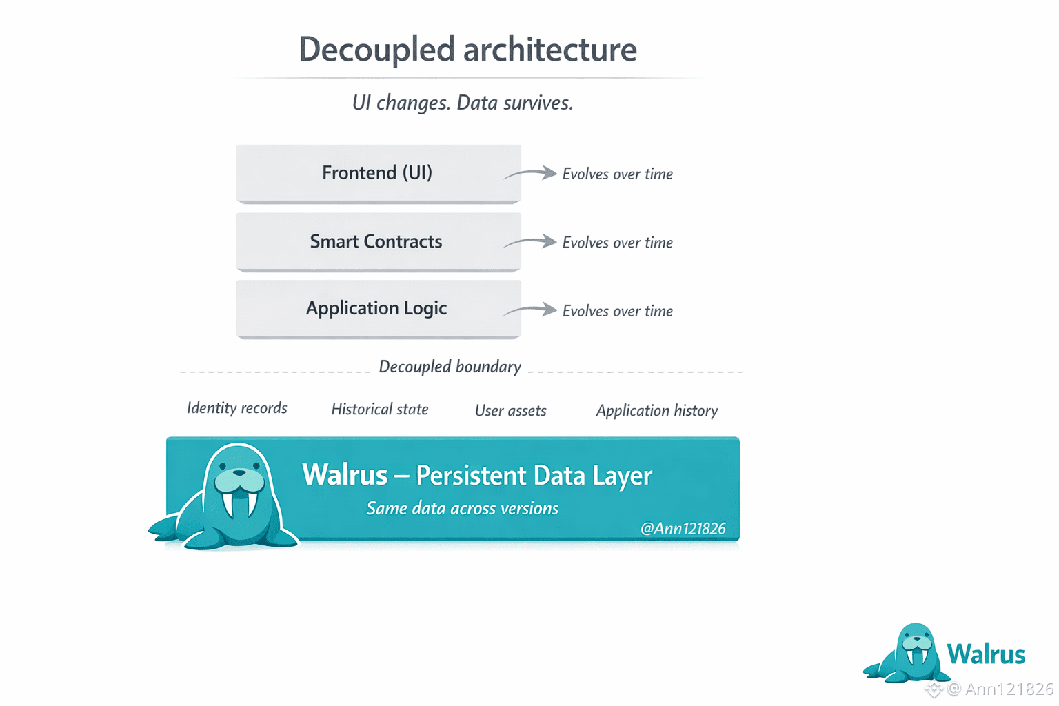 En Web2 esto es normal. Un banco no reinicia su base de datos cada vez que cambia su app móvil. Un videojuego no borra el progreso global porque lanzó un nuevo cliente. En Web3, en cambio, esa continuidad casi nunca existió de forma robusta. Walrus acerca ese modelo al mundo descentralizado sin convertirlo en algo centralizado.