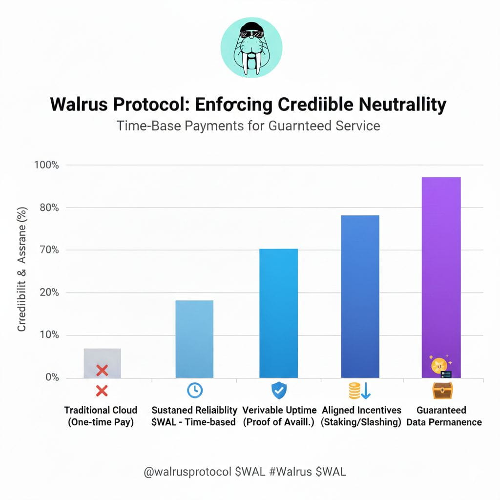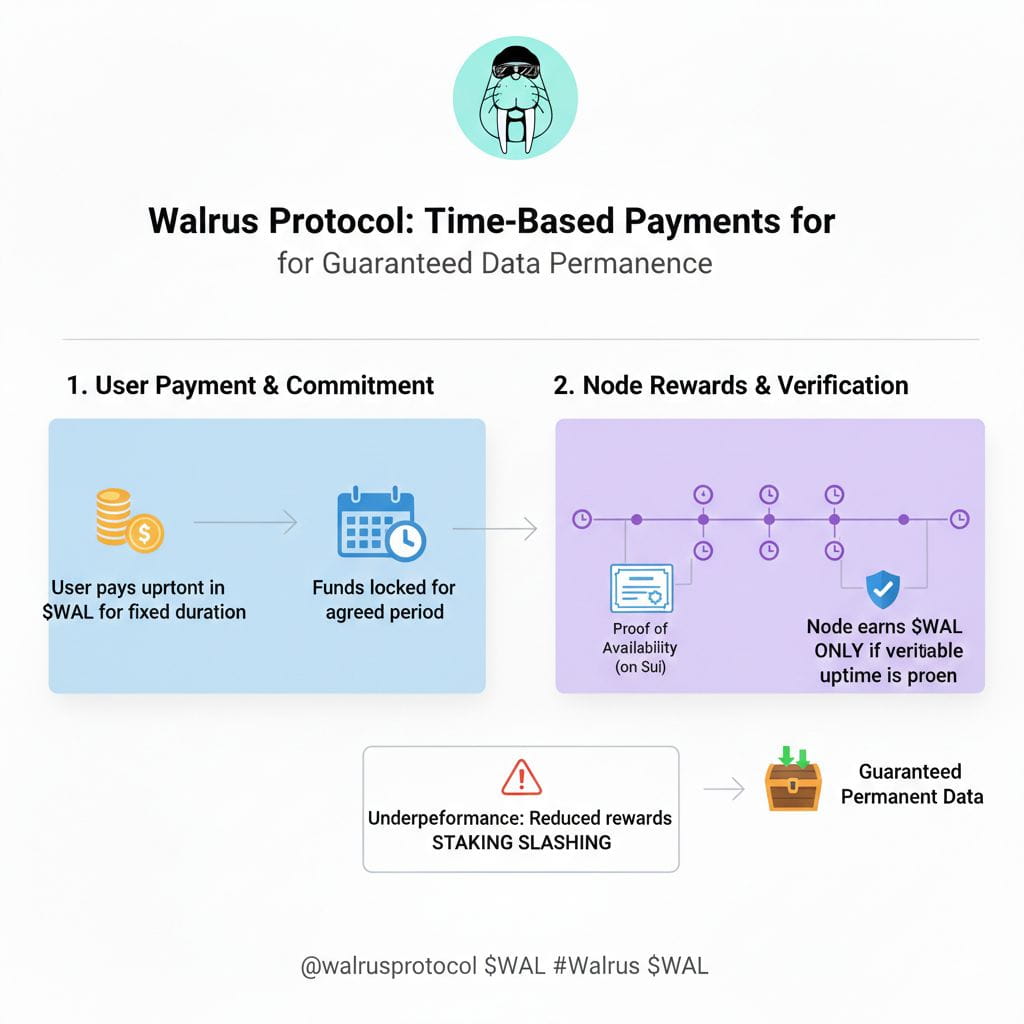 When I first dug into Walrus Protocol's economic structure, I noticed how time based payments stand out as a deliberate choice to enforce genuine, ongoing service guarantees in a decentralized setup. Traditional one time payments can leave users vulnerable if nodes stop performing after collecting fees, but Walrus distributes rewards over time to tie earnings directly to sustained reliability.
