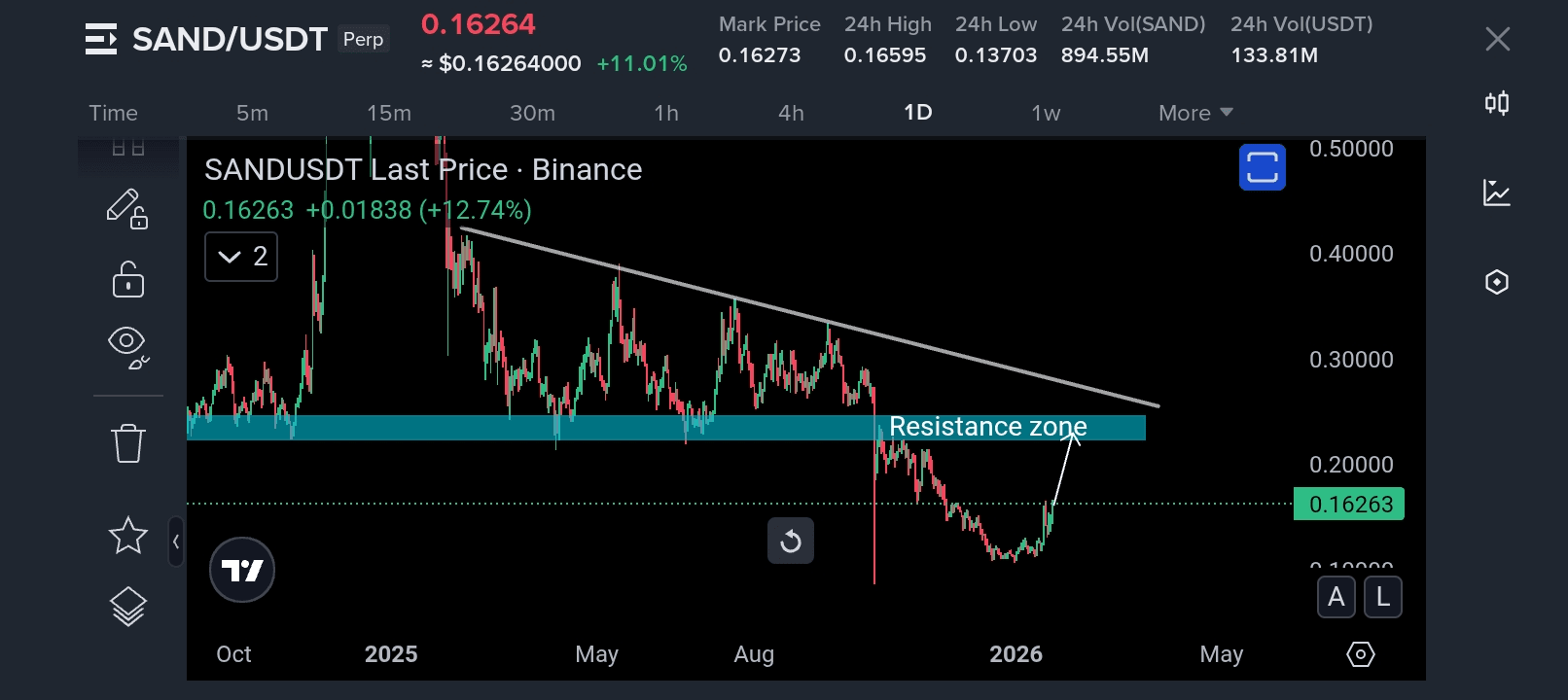 Lange Zeit blieb SAND unter Druck und respektierte eine absteigende Trendlinie, die den Preis weiterhin nach unten drückte. Jeder Versuch, nach oben zu bewegen, wurde verkauft, was bestätigte, dass die Verkäufer die Kontrolle hatten. Dies ist ein klassisches Beispiel dafür, wie Trends Märkte dominieren, bis sich etwas strukturell ändert.
