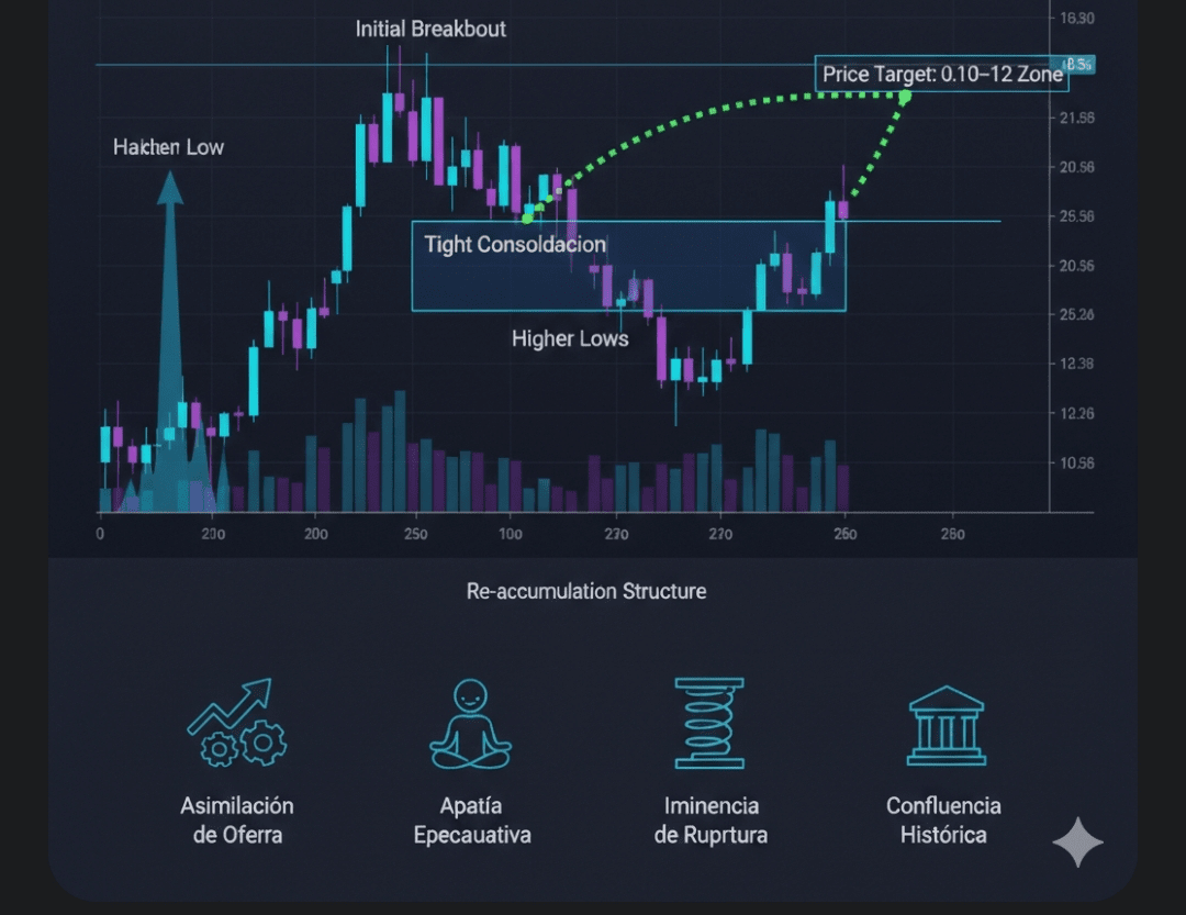 Angebotsassimilation: Der Markt absorbiert die aktuellen Verkäufe, ohne dass der Preis fällt, was die Basis der Bewegung verstärkt.
