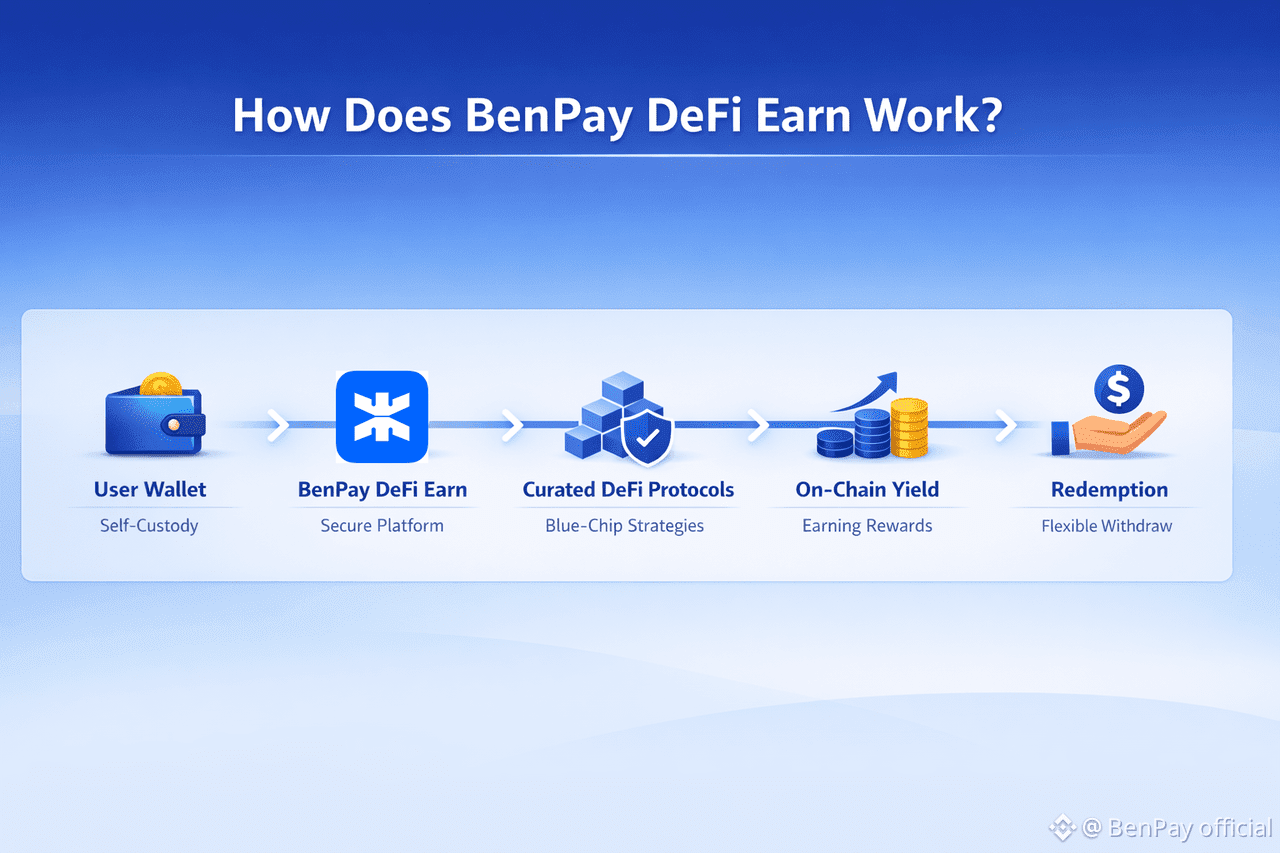 User Wallet → BenPay DeFi Earn → Curated DeFi Protocols → On-Chain Yield → Redemption