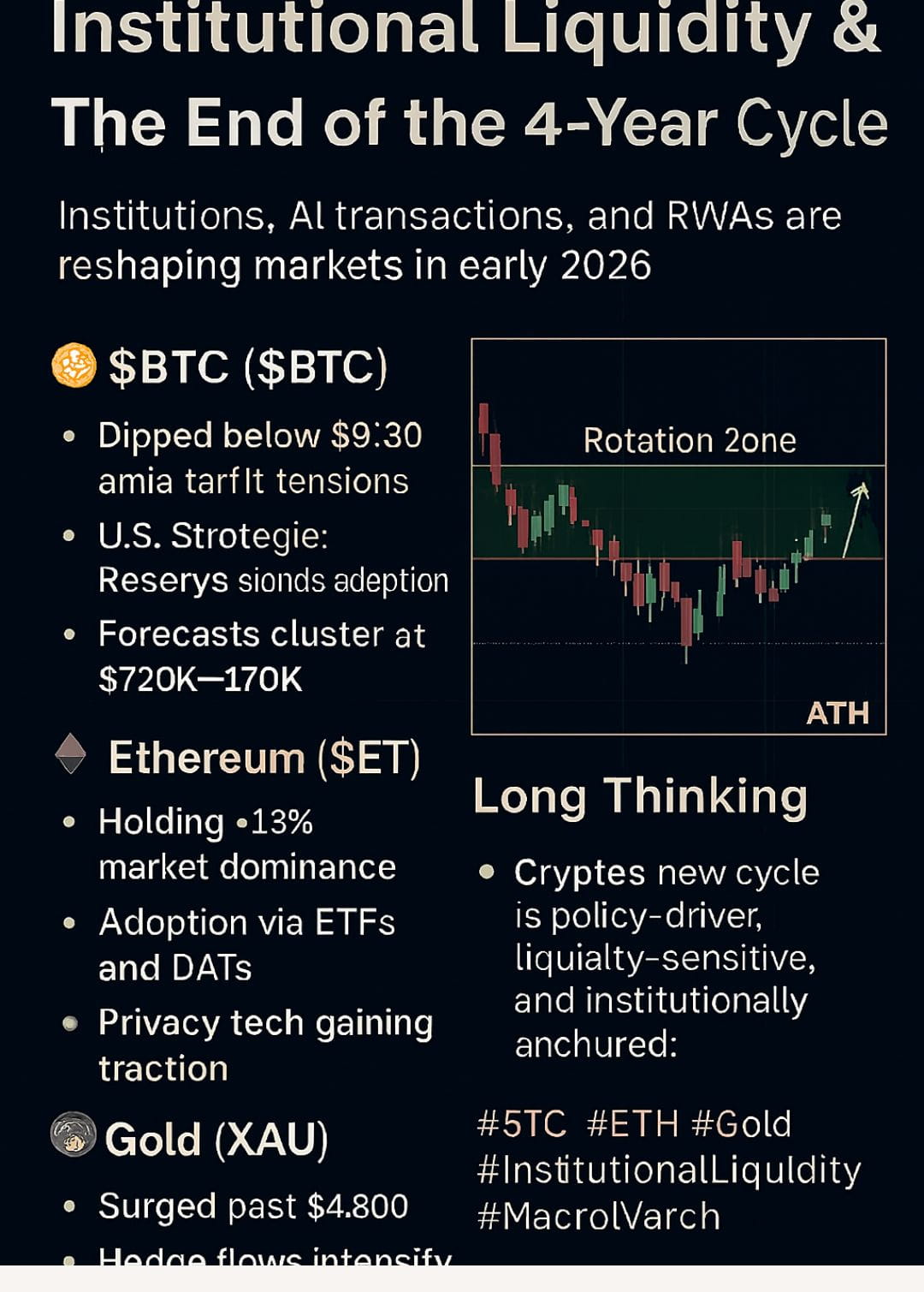 🧭 In early 2026, the crypto market is undergoing a structural shift. The traditional four-year cycle — once driven by retail hype and halving events — is being replaced by institutional liquidity flows, AI-driven transactions, and real-world asset tokenization. This article explores how Bitcoin, Ethereum, and Gold are now shaped by macro shocks, policy decisions, and strategic reserves rather than speculative momentum.