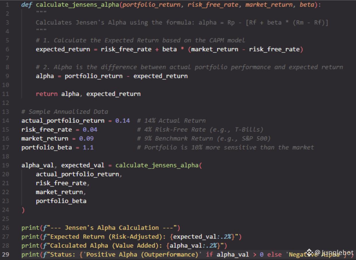 To distinguish skill from mere luck, professionals use Jensen’s Alpha, which is rooted in the Capital Asset Pricing Model (CAPM). This formula allows us to isolate pure added value: