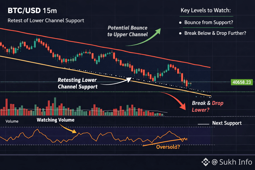 On the 15m chart, BTCUSD appears to be trading inside a descending (or parallel) price channel and is currently retesting the lower boundary of that channel.