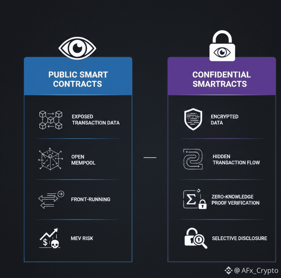 Standard smart contracts excel in open, permissionless experimentation. However, as blockchain adoption moves toward institutions and regulated markets, privacy becomes infrastructure, not a feature.