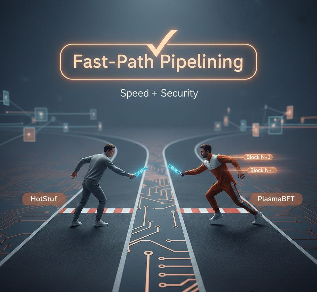 PlasmaBFT takes a fresh approach. Using a method called Fast HotStuff, it doesn’t wait for each step to finish before moving on. Instead, it finalizes a block as soon as the next one also reaches agreement. In other words, while the network is voting on block N+1, block N is already finalized. That pre-commit step? Skipped entirely. The result is smoother, faster, and more efficient block processing without ever cutting corners on safety.
