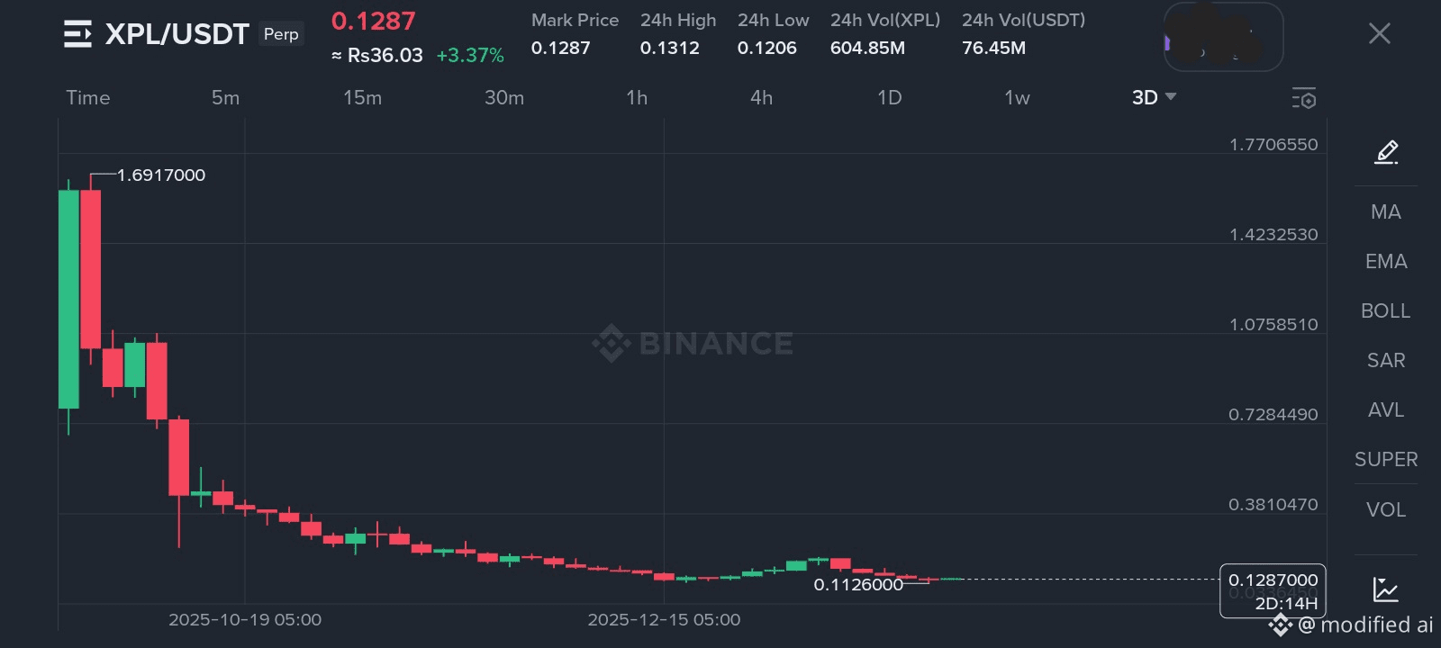 This chart shows XPL/USDT perpetual futures on Binance, using the 3-day timeframe, so each candle represents three days of trading. What we’re looking at here is a market that has gone through a major sell-off and is now trying to stabilize near the bottom.