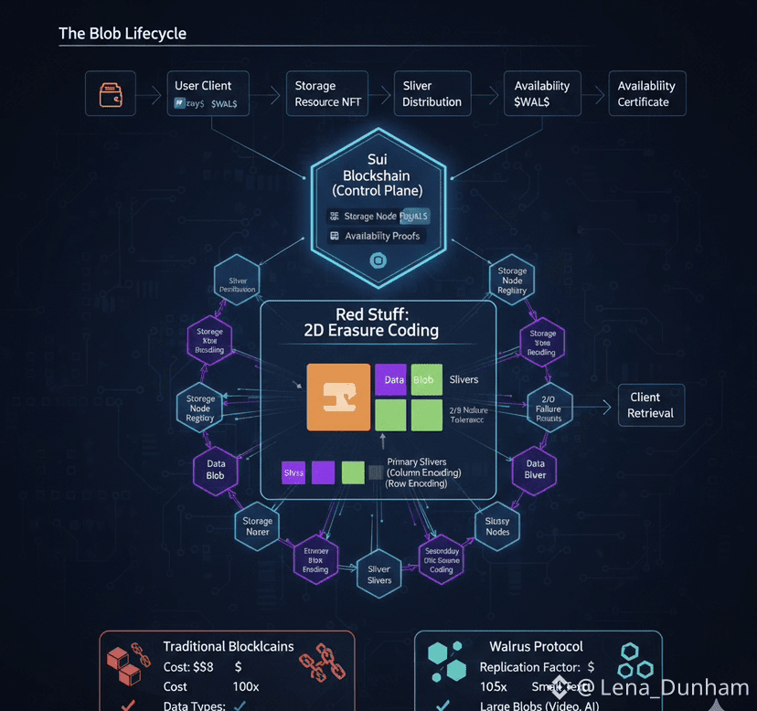 At its core, Walrus is not just a storage service — it’s a foundational infrastructure layer that treats data as a first-class programmable asset. Instead of forcing developers to store large files on-chain (which is prohibitively expensive and inefficient), the protocol stores only on-chain metadata and proofs of availability, while the raw data itself (“blobs”) is distributed across a network of decentralized storage nodes.