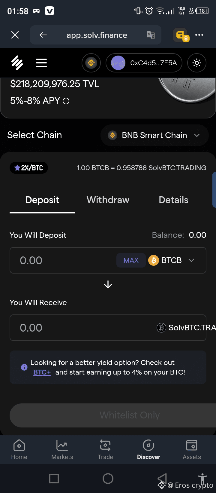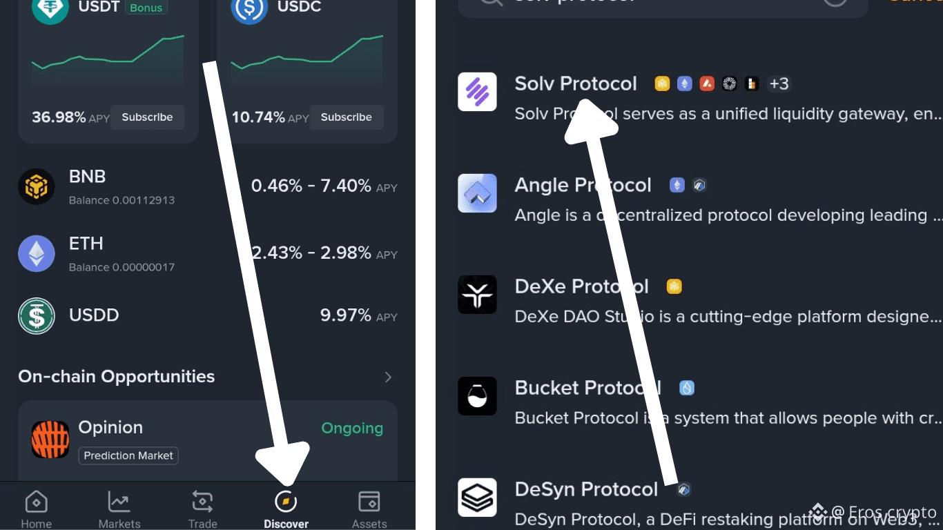 Connectez vous sur votre wallet binance ensuite cliquez sur discover puis tapez sur la barre des recherches "Solv protocol"