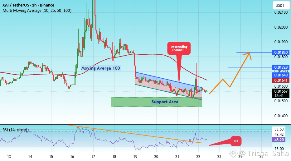 There is a key support zone in green at 0.01490. The price has bounced from this level several times and is expected to bounce again.