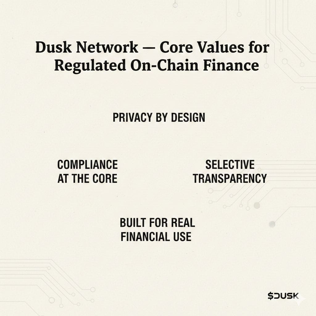 Dusk Network ko samajhne ke liye features se zyada uske core values ko dekhna zaroori hai. Yeh project kisi generic blockchain experiment ki tarah approach nahi karta. Iski design philosophy shuru se hi un real problems ke around bani hai jahan finance, privacy aur regulation ek saath exist karte hain.