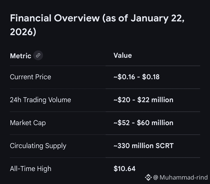 Recent Price Surge: SCRT recorded a 35.2% gain in a 24-hour period on January 19, amidst a broader rally for privacy-focused cryptocurrencies. This was attributed to a technical breakout above key resistance levels with a significant surge in trading volume.