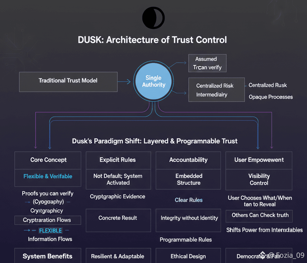 At the core of Dusk’s design is a simple idea: trust works better when it’s flexible,not locked into one place.Traditional models lean on a single gatekeeper a bank,a tech giant, some institution to check the facts and enforce the rules.It works,but it piles up risk, hides what’s going on,and puts too much power in too few hands.Dusk breaks this by layering trust throughout the system.Here, trust comes from proofs you can verify, cryptography that holds up under scrutiny, and information flows that aren’t wide open but carefully controlled.