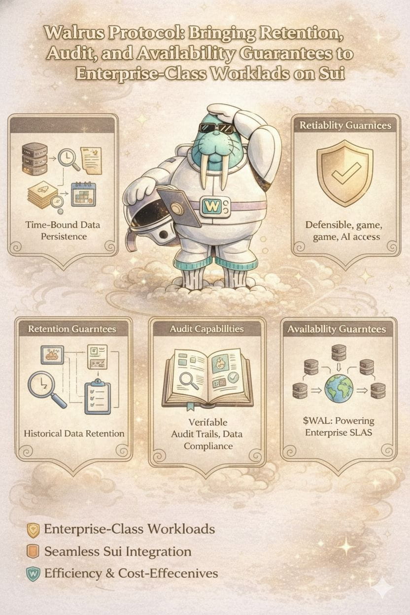 Enterprises do not adopt new platforms because they are decentralized. They adopt them when guarantees become measurable, enforceable, and auditable. For most of Web3’s history, those guarantees only existed for computation and settlement. Data persistence remained a weak link handled with off-chain buckets, proprietary storage vendors, or opaque gateway systems that broke the trust model as soon as sensitive or long-lived data was involved. Walrus Protocol introduces a missing layer for Sui: retention, auditability, and availability as native infrastructure properties instead of hope-based operational assumptions.