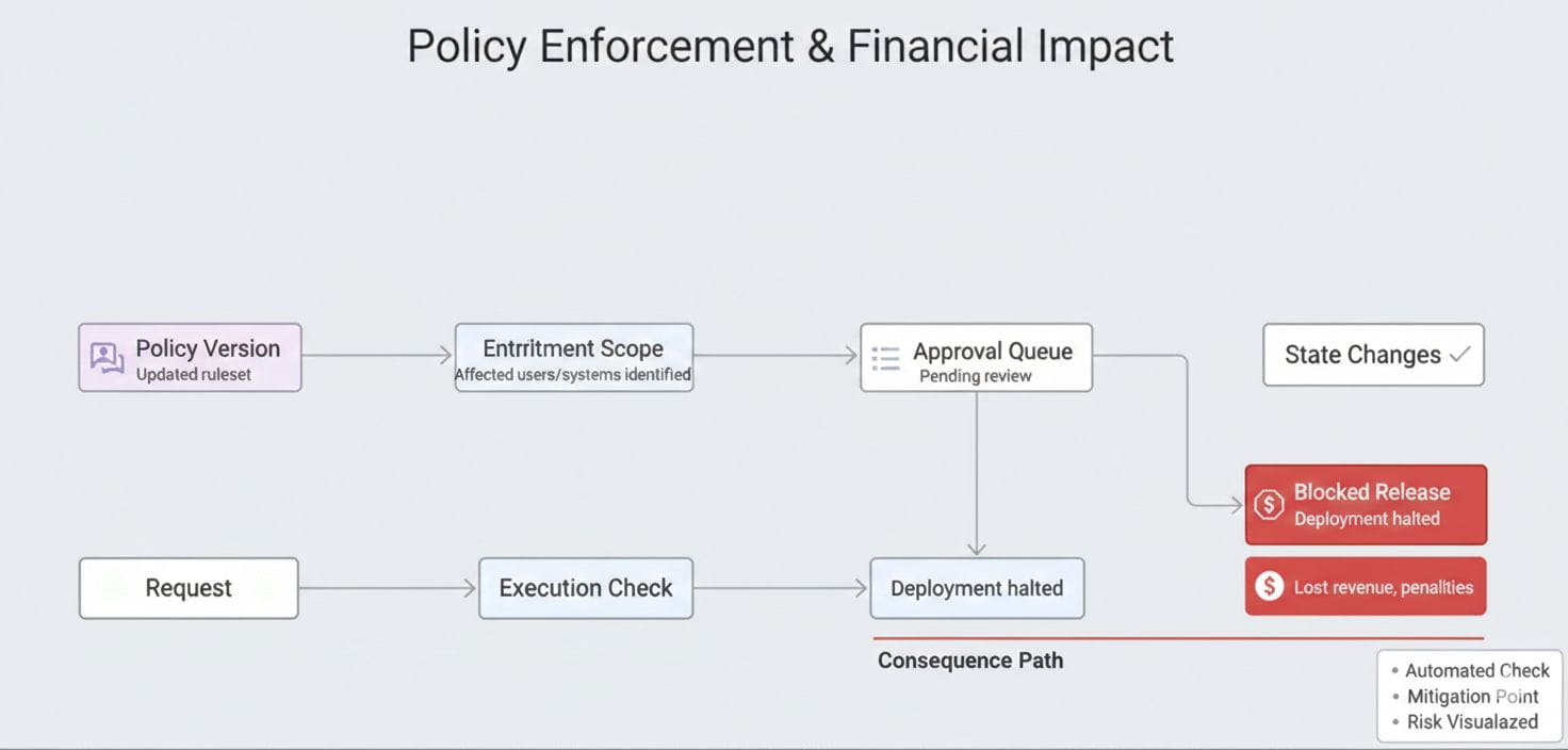 Governance versioning isn’t a note in a PDF. It’s enforced at execution. If a transaction falls under a new version, the system gates it. The executor’s dashboard shows success, the compliance view blocks release until a named reviewer certifies alignment. A misaligned policy doesn’t create a warning; it creates a workflow freeze.