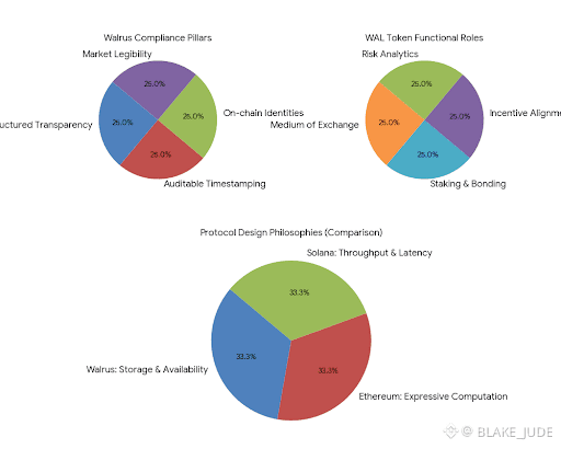 When compared analytically to networks such as Ethereum or Solana Walrus illustrates a shift in design philosophy rather than a competitive displacement. Ethereum prioritizes expressive computation but depends heavily on external data availability layers and third party analytics providers to meet institutional reporting standards. Solana emphasizes throughput and low latency execution yet its historical reliability challenges highlight the difficulty of reconciling performance with operational transparency. Walrus narrows its functional scope to storage and availability but executes that scope with financial grade introspection. This specialization allows analytics to be native rather than layered which increasingly aligns with institutional preferences.