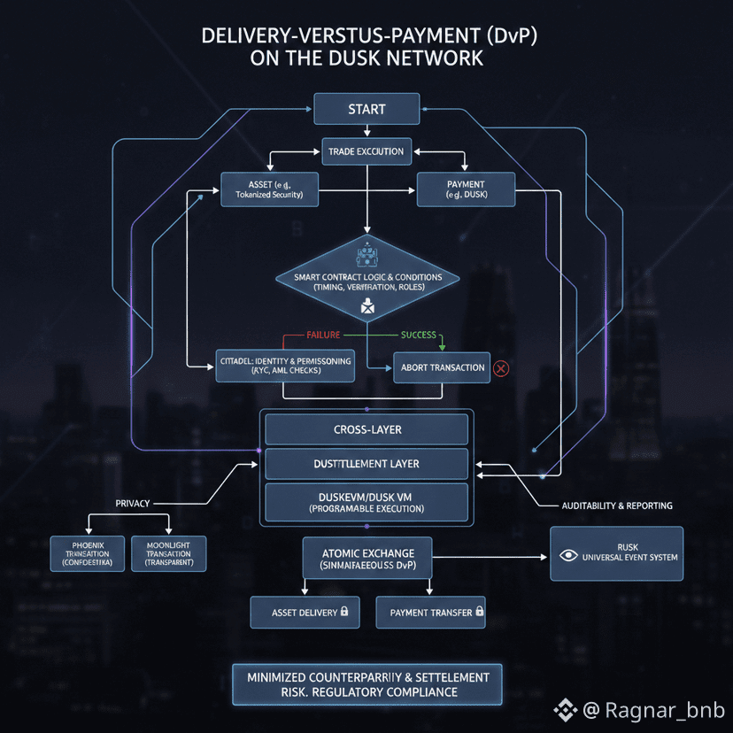 Basically, Delivery-versus-Payment on the Dusk Network gives you a built-in way to settle deals securely, privately, and in line with the rules. By mixing finality, identity checks, smart contracts, and privacy features, Dusk makes atomic exchanges possible for modern regulated markets. DvP is a key thing for getting big institutions on board and building real financial systems on Dusk Network.