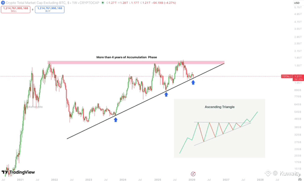 قدّم Ash Crypto مخططًا يُظهر أن سوق العملات البديلة لا يزال يحافظ على منطقة دعم طويلة الأجل. يعرض المخطط القيمة السوقية الإجمالية لجميع العملات البديلة، باستثناء بيتكوين، ويُظهر قاعًا قريبًا من مستوى 1.2 تريليون دولار. وهي منطقة صمدت كدعم على مدى أربع سنوات. وعلى الرغم من تقلبات السوق في الفترة الأخيرة، لم تنخفض الأسعار دون هذا النطاق. ويشير ذلك إلى وجود حاملي مراكز طويلة الأجل لا يزالون يدافعون عن مستوياتهم ويمتصون ضغوط البيع.