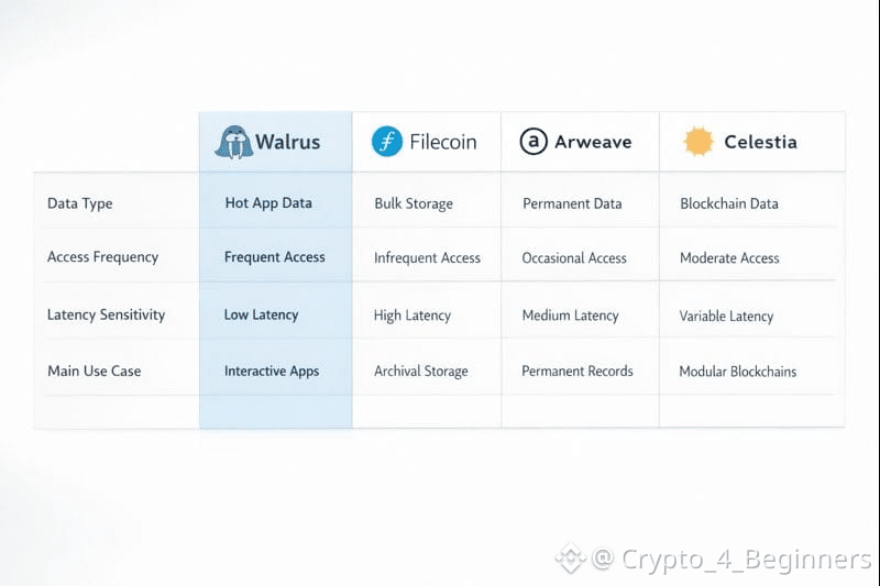 In my assessment the fairest way to evaluate Walrus is not to compare it headline to headline with Filecoin or Arweave but to compare use cases. Arweave's public metrics show over 200 terabytes of permanently stored data which is impressive but permanence is its core value. Filecoin according to Protocol Labs updates excels at decentralized archival storage and retrieval markets. Walrus sits in a different lane. It competes more directly with modular data availability solutions like Celestia and EigenDA. Celestias mainnet numbers show more people are using blobs thanks to rollups. Still Celestia is not really about letting apps interact with data. It's about publishing data so others can verify it. Walrus on the other hand, is built for apps that need to read, update and work with data all the time.