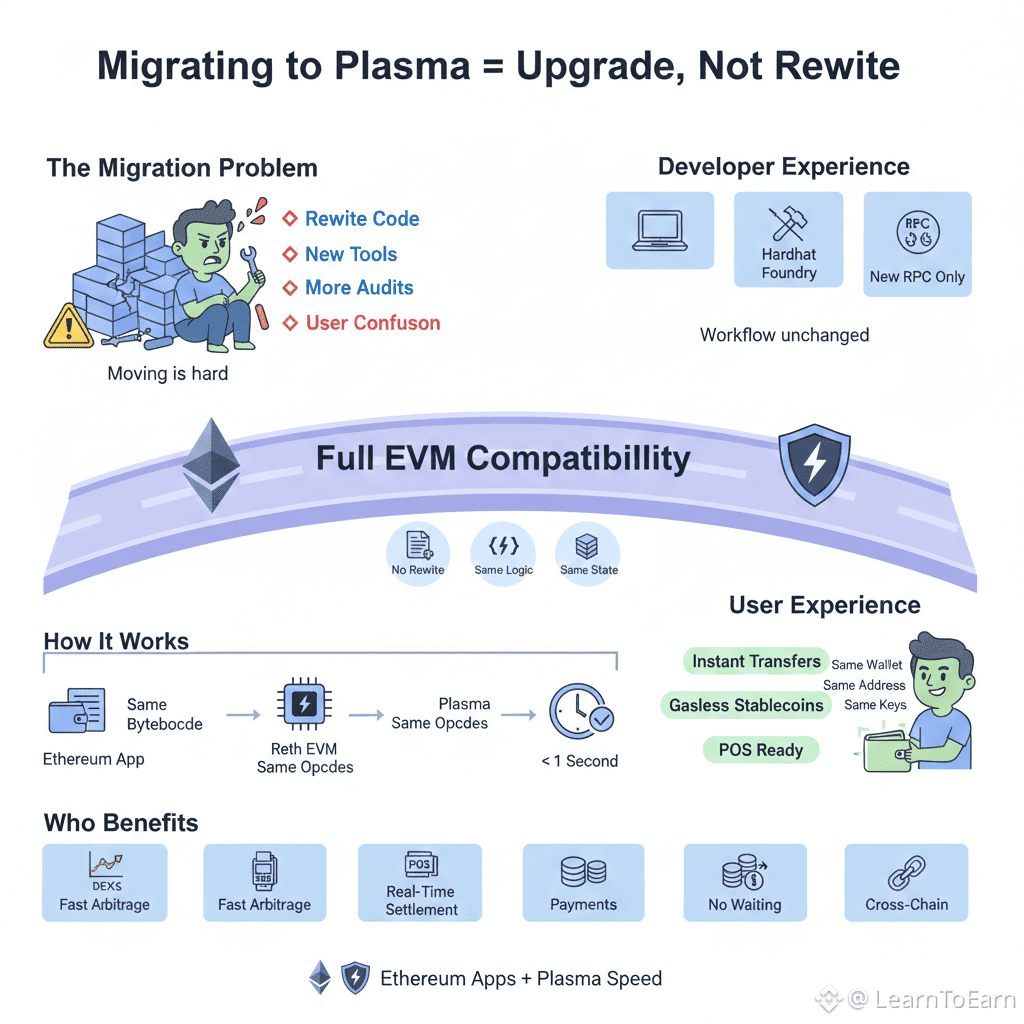 In the fast-moving world of blockchain, teams are constantly tempted by new networks that promise faster execution, lower fees, or purpose-built features. Yet this promise collides with a stubborn reality: migrating an existing decentralized application is usually expensive, risky, and disruptive. Code must be rewritten, assumptions revisited, audits repeated, and users re-educated. These switching costs create a migration paradox in which developers recognize better infrastructure but remain anchored to older systems because moving is simply too costly. Plasma was designed to break this paradox. As a high-performance stablecoin settlement layer, it approaches migration not as a painful rebuild, but as a rational upgrade made possible through full, bytecode-level Ethereum Virtual Machine compatibility.