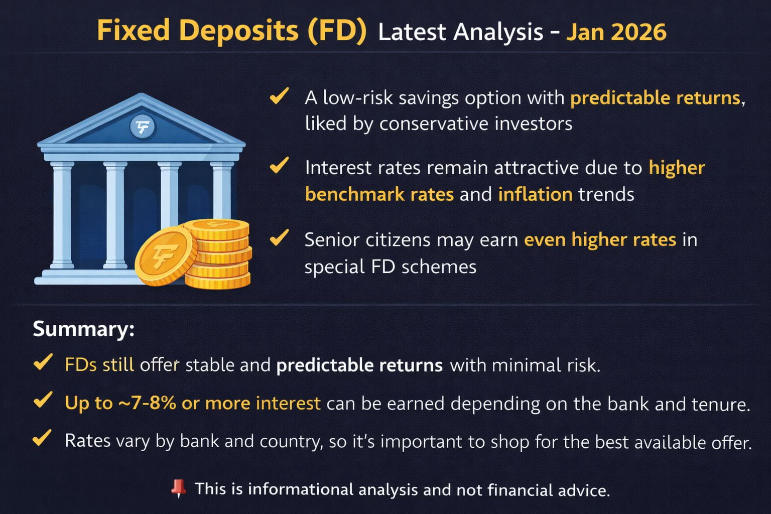 $FDUSD Festgelder bleiben eine risikoarme Sparoption fĂźr konservative Anleger und bieten im Vergleich zu volatileren Anlagen wie Aktien oder Krypto vorhersehbare Zinserträge. In vielen Banken bleiben die FD-Zinssätze relativ attraktiv aufgrund von anhaltend hohen Benchmark-Zinsen und Inflationserwartungen. In einigen Märkten bieten Banken Zinssätze von bis zu etwa 7%â8% fĂźr mehrjährige Festgelder fĂźr allgemeine Anleger an, wobei fĂźr Senioren in ausgewählten Programmen sogar hĂśhere Zinssätze verfĂźgbar sind.