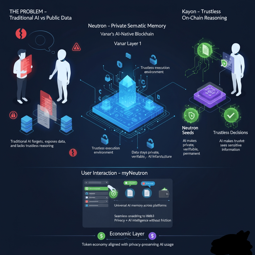 Wenn ich mir anschaue, wohin die KI geht, sehe ich eine klare Spannung, die die Branche nicht länger ignorieren kann. Wir fordern von KI-Systemen, autonomer zu werden - Brieftaschen zu verwalten, Zahlungen auszuführen, private Dokumente zu analysieren und Entscheidungen in unserem Namen zu treffen. Gleichzeitig sind wir uns jedoch zunehmend bewusst, dass es nicht nachhaltig ist, unsere Daten an zentrale Systeme zu übergeben. Intelligenz benötigt Gedächtnis und Kontext, doch Kontext ist zutiefst persönlich und sensibel. Dieser Konflikt ist einer der Hauptgründe, warum KI Schwierigkeiten hat, sich sinnvoll mit Web3 zu integrieren. Öffentliche Blockchains verlangen nach Transparenz, während nützliche KI nach Privatsphäre verlangt. Was meine Aufmerksamkeit auf Vanar Chain lenkte, ist, dass es nicht versucht, einen Kompromiss zwischen beiden einzugehen - es entwirft die Architektur neu, sodass beide koexistieren können.