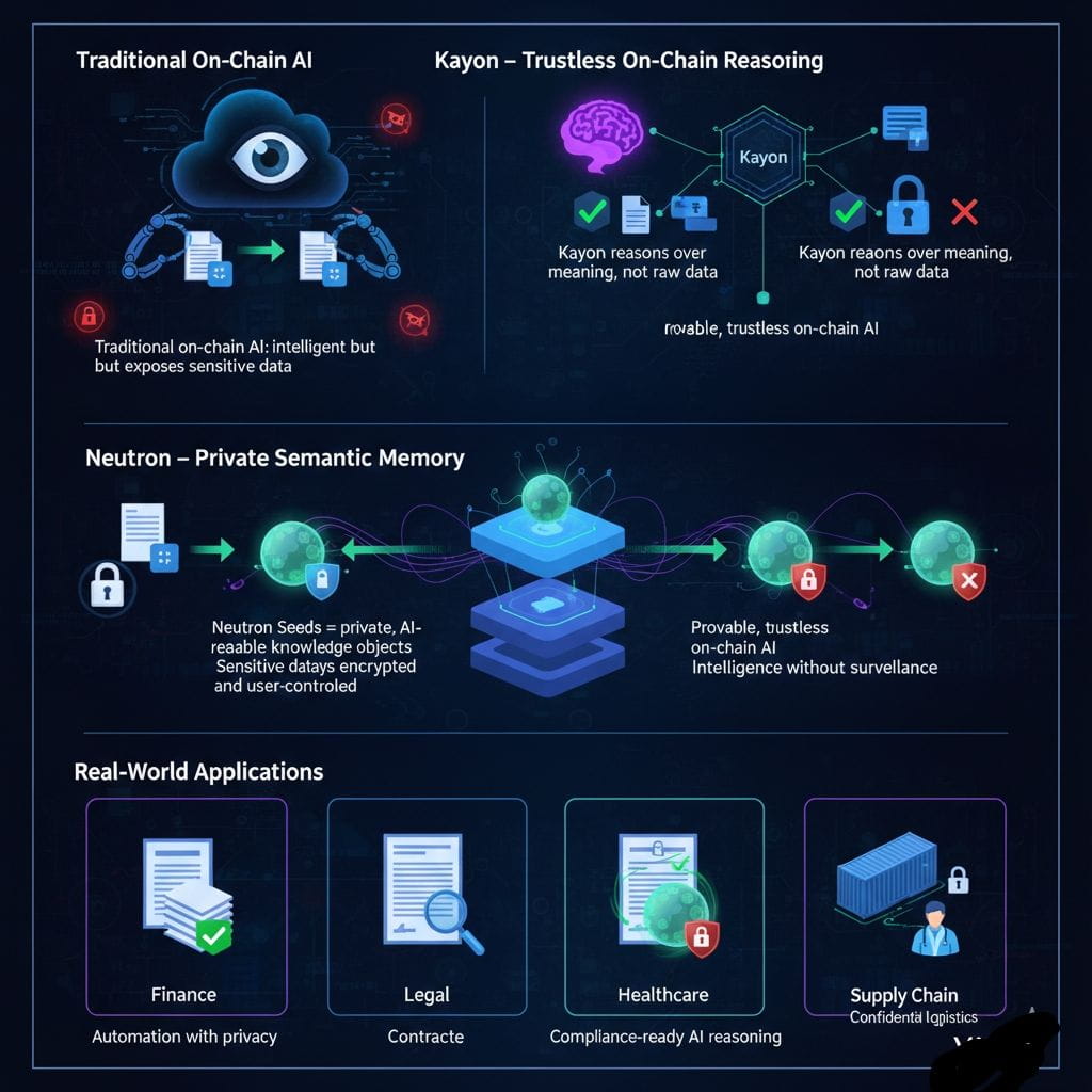 Die Argumentation über diesen privaten Kontext wird von Kayon übernommen, und hier wird Vanars Vision von vertrauensloser KI wirklich für mich klar. Kayon ist eine on-chain-Argumentationsmaschine, die es Smart Contracts und KI-Agenten ermöglicht, Fragen zu Neutron-Samen zu stellen und verifizierbare Antworten zu erhalten, ohne auf die Rohdaten zuzugreifen. Anstatt einem zentralisierten KI-Dienst zu vertrauen, um „das Richtige zu tun“, verlässt sich das System auf kryptografische Garantien und deterministische Logik.