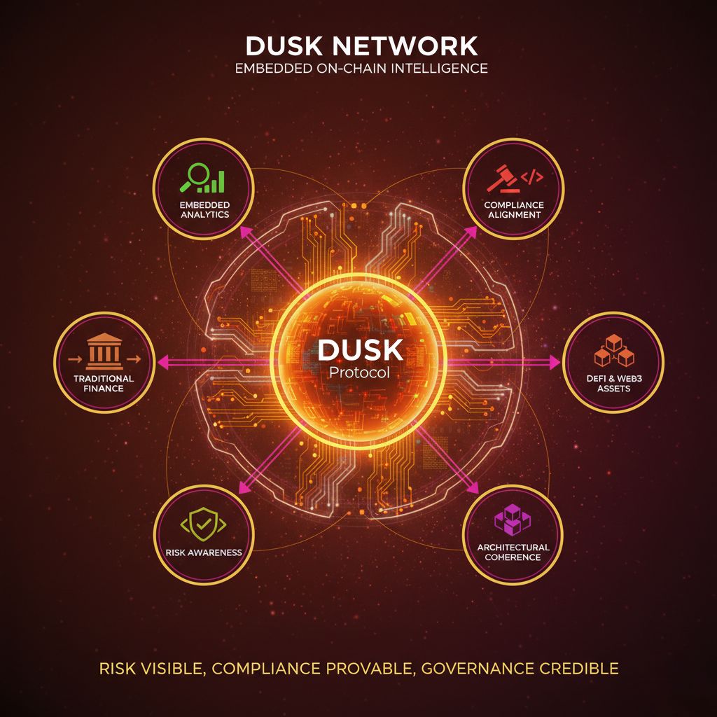 From an institutional perspective, the significance of Dusk lies not in any single feature but in its architectural coherence. Analytics, risk management, compliance, and oversight are not external layers competing for data access. They are native properties of the protocol, enforced through cryptography and consensus. This reduces operational complexity and aligns incentives across participants, from developers and validators to regulators and end users.