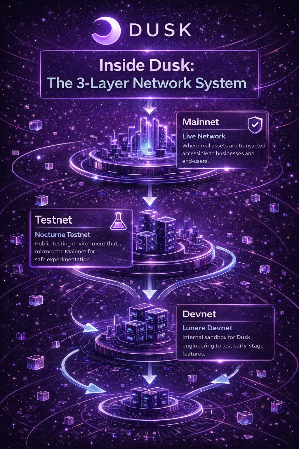 Dusk Network isn’t trying to be “just another chain” competing for attention. It’s building something far more structured: a blockchain ecosystem designed for privacy-preserving finance, compliant digital assets, and real-world institutional usage. And one of the most underrated parts of this design is how Dusk splits the ecosystem into multiple network environments, each built for a specific stage of development and testing. When you truly understand how Mainnet, Testnet, and Devnet work together inside Dusk, you start seeing why the project feels more like professional infrastructure than a typical crypto experiment.