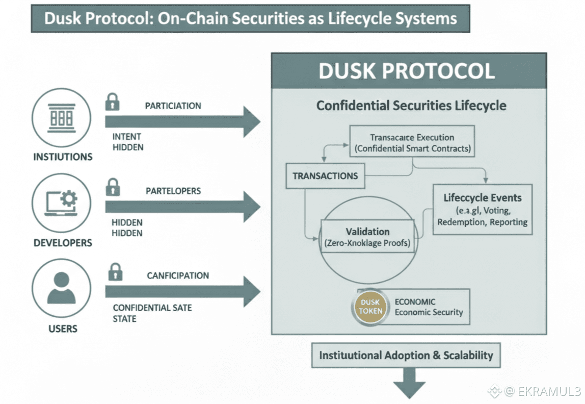 Dusk is one of the first blockchains that treats tokenization with that level of seriousness. It does not stop at minting. It does not assume trading equals adoption. It frames tokenized securities as lifecycle instruments that need compliance, confidentiality, settlement guarantees, and event-driven mechanics. This shift matters because lifecycle is where traditional financial infrastructure makes its money and where most crypto tokenization attempts silently fail.