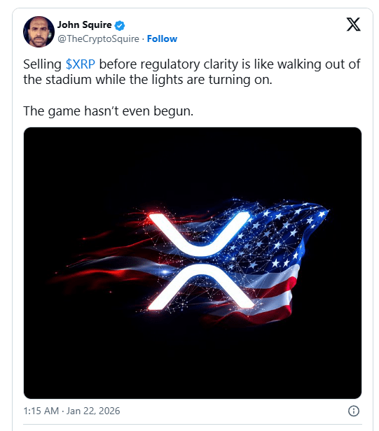 Squire verglich den Verkauf von XRP zu früh mit dem Verlassen eines Stadions, gerade als die Lichter angehen. Die Analogie hob das Risiko hervor, eine Position vor Beginn der Hauptveranstaltung aufzugeben. Seine Einordnung verbreitete sich schnell in der XRP-Community und entfachte eine breitere Diskussion.