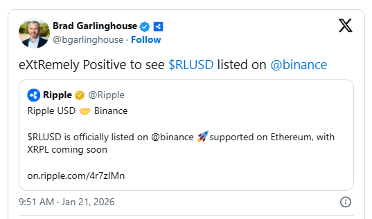 $XRP Ripple-CEO Brad Garlinghouse erkannte XRP subtil an, während er auf die offizielle Ankündigung von Binance zur Listung von Ripples Stablecoin, RLUSD, reagierte. Die Börse hat bestätigt, dass der Handel mit RLUSD am 22. Januar 2025 beginnen wird, mit Auszahlungen, die am folgenden Tag eröffnet werden.