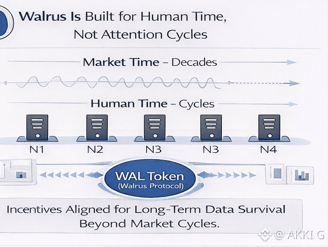 Most systems in crypto are built around market time. They are designed to perform well during periods of attention, growth, and activity. When conditions change, priorities shift. Data may still exist, but responsibility for it weakens. Walrus is built around a different clock. It is designed for human time, where data is expected to remain meaningful long after market cycles have passed.