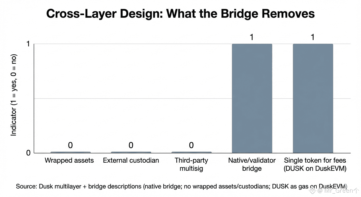 A strong cross-layer system also needs a clear answer to “where is truth recorded?” In a modular stack, execution happens on the execution layer, but settlement truth is often anchored in the base layer. The clean mental model is: DuskEVM runs the application logic and produces outcomes; DuskDS is where final settlement and canonical records live. Bridging is how outcomes and value move in and out of the EVM environment without weakening that anchor. That is why Dusk’s modular story only works if the bridge is reliable: otherwise the separation becomes friction instead of clarity.