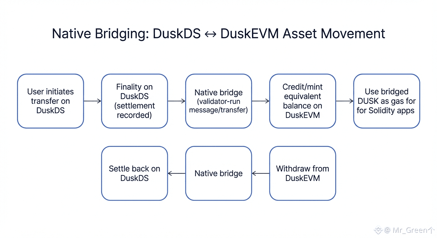 The architectural reason is straightforward. DuskDS is optimized for the parts finance cares about most: settlement integrity, consensus, and the privacy-enabled transaction model. DuskEVM is optimized for what builders care about: an Ethereum-compatible environment where Solidity apps can run without forcing teams to learn a new execution model. If these layers don’t share a reliable native path for assets and messages, the system becomes two chains with an awkward relationship. Users would have to decide where to live, liquidity would fragment, and application design would constantly fight the boundary. A native bridge is what makes modularity usable: assets move to the environment where they deliver the most value, and then they can return to the settlement layer when final accounting matters.
