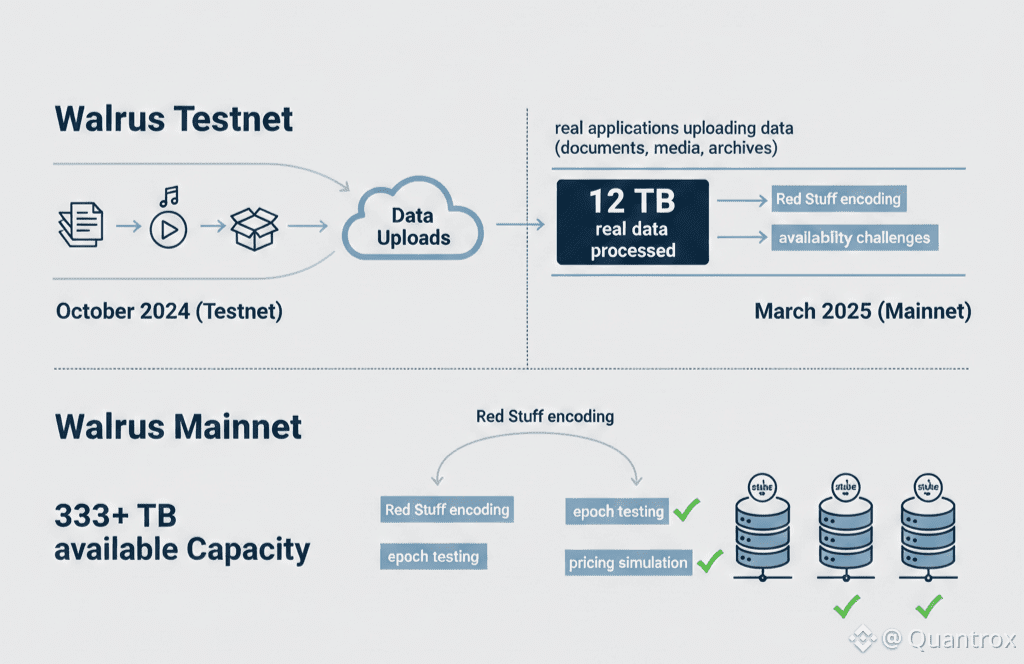 Walrus processed 12 terabytes during testnet then jumped to 333+ terabytes capacity on mainnet. That scale increase happened because testnet proved the architecture could handle growth. Operators knew expanding infrastructure made sense because coordination had been validated. Without testnet proof, mainnet capacity would have started much smaller.