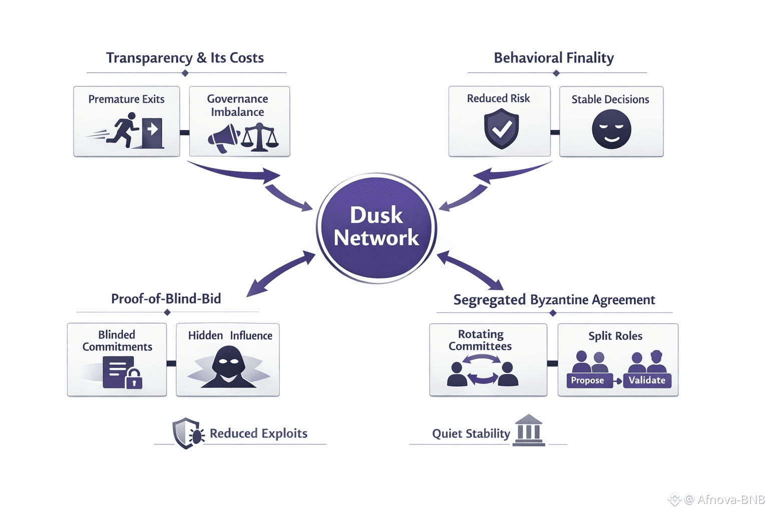 Dusk starts from a different premise distrust incentives before you distrust math. Proof-of-Blind-Bid isn’t a clever add-on to staking; it’s an acknowledgment that early disclosure is dangerous. By forcing validators to submit blinded commitments, the protocol removes the ability to game selection before it occurs. Influence only becomes visible after it has already mattered. That single constraint wipes out an entire category of attacks most systems simply tolerate.