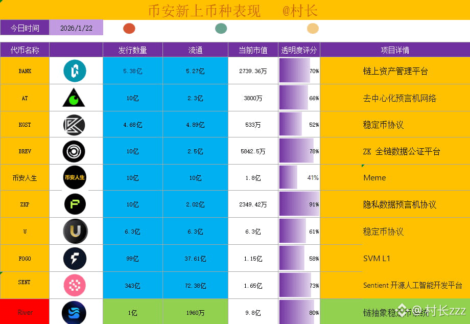 对比流通量和市值的关系,比如 #RIVER 流通1960万,市值9.8亿;#ZKF 流通2.02亿,市值2349.42万;币安人生流通10亿,市值1.8亿。透明度高的项目,流通量相对较小但市值更高,说明资金使用效率更高,市场对其估值更乐观,因为透明带来的信任让人愿意以更高溢价持有。高透明度意味着项目技术路径、团队背景、落地规划更清晰,更易获得长期资金布局。