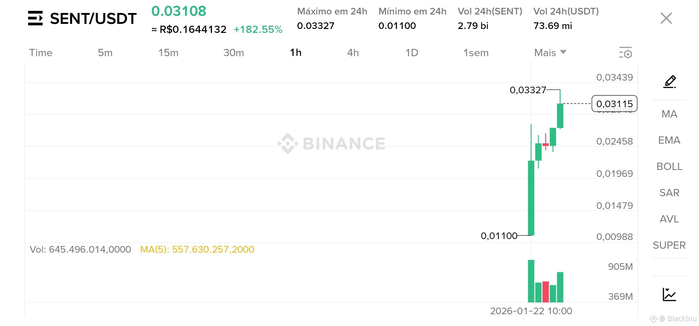 A barra de volume mostra: 645M vs MA(5) de 557M → CONFIRMAÇÃO DE ENTRADA DE “SMART MONEY”?