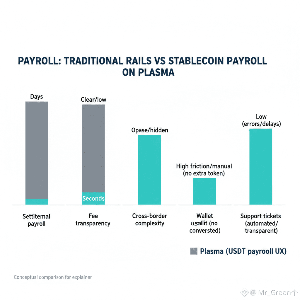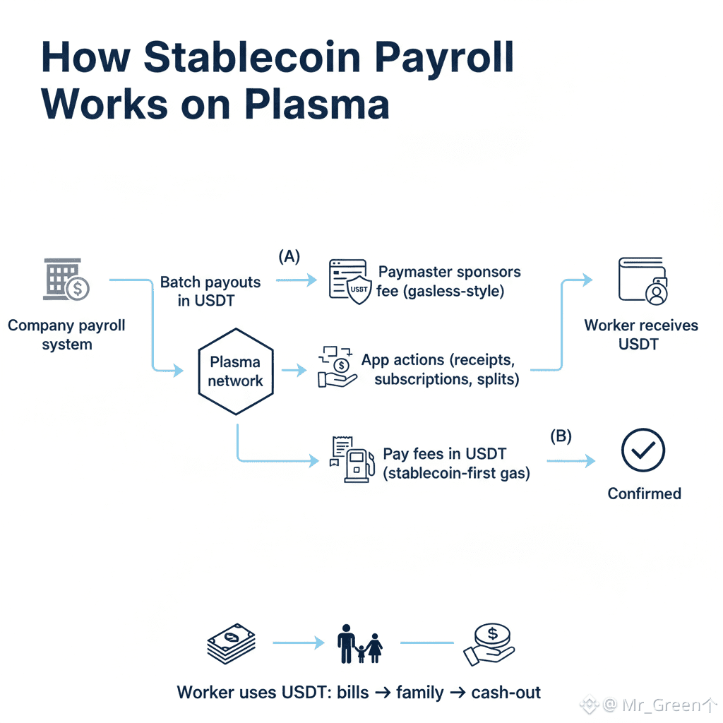 Stablecoins changed the conversation because they made a simple promise: dollars that move like messages. A company can pay a designer in another country in minutes instead of days, and the designer receives something that behaves like a dollar, not a volatile asset. But in practice, stablecoin payroll still runs into a beginner-unfriendly hurdle. Many blockchains require a separate gas token to move the stablecoin. That means the worker can receive USD₮ (USDT) and still be unable to move it, consolidate it, or pay someone else unless they acquire an additional token first. It’s a small detail that becomes a big trust problem the moment payroll is involved, because “you need to buy fuel to use your salary” does not sound like modern finance.