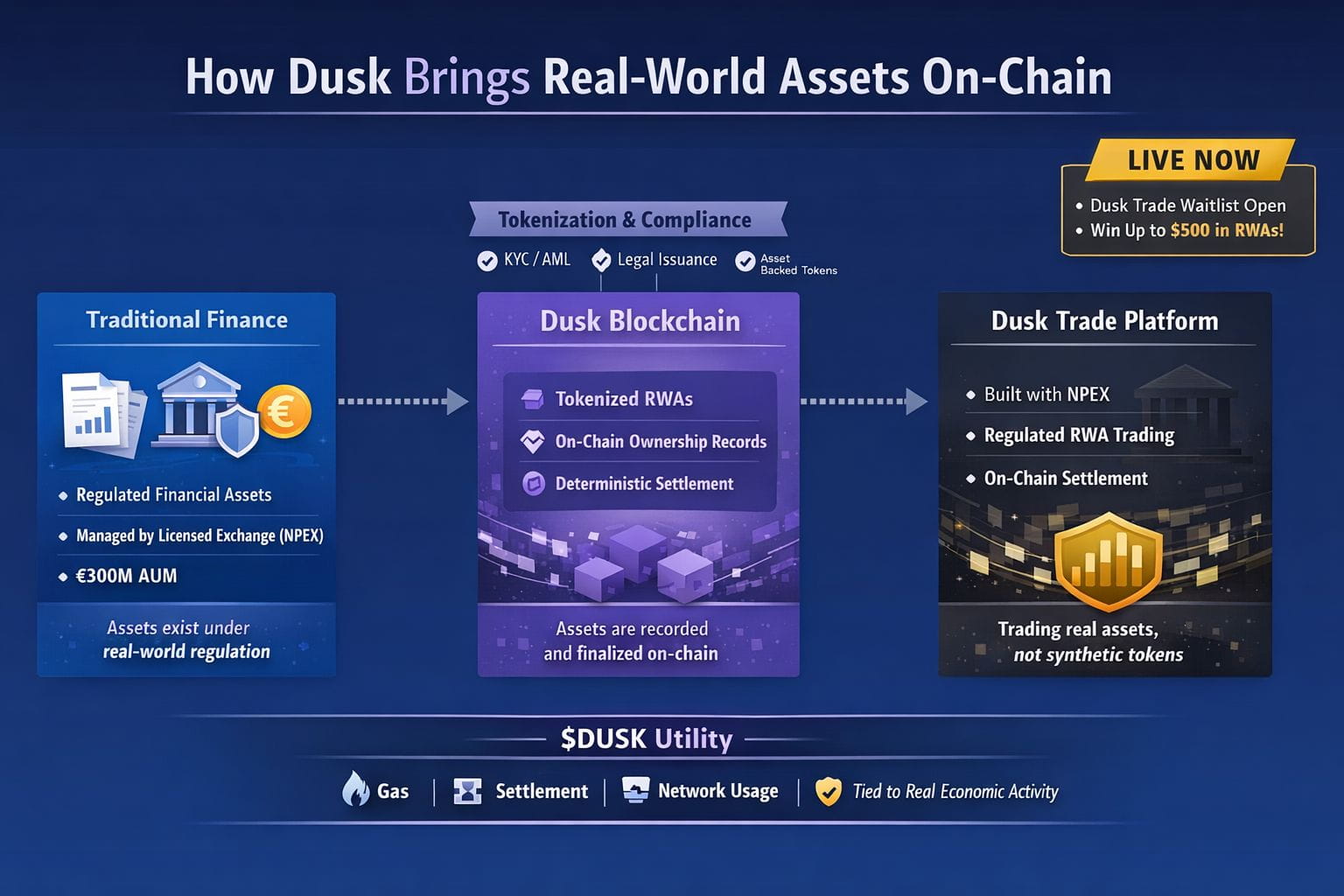 Aus technologischer Sicht integriert Dusk Tools, um Compliance aufrechtzuerhalten und Sicherheit zu bieten. Die Blockchain gewährleistet, dass die Abwicklung unumkehrbar und endgültig ist.
