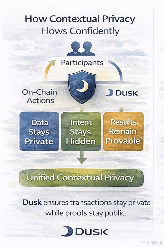 Dusk introduces contextual privacy, where intent, execution, and sensitive data remain protected, while outcomes and compliance proofs remain verifiable. This allows participants to operate without fear of exposure while still enabling oversight when required. It reflects how real institutions function. Internal strategies are private. Final results are auditable.