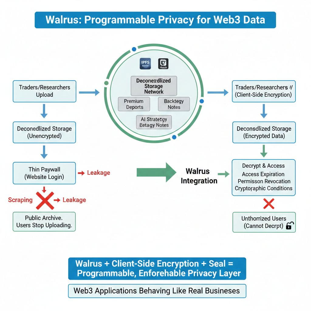 Imagine building a Web3 research platform for traders: premium datasets, private reports, backtests, AI-generated strategy notes. If those files live on decentralized storage without encryption gating, you’ve effectively built a public archive with a thin paywall. Scraping is inevitable. Leakage is inevitable. And your most serious users will eventually stop uploading anything valuable.