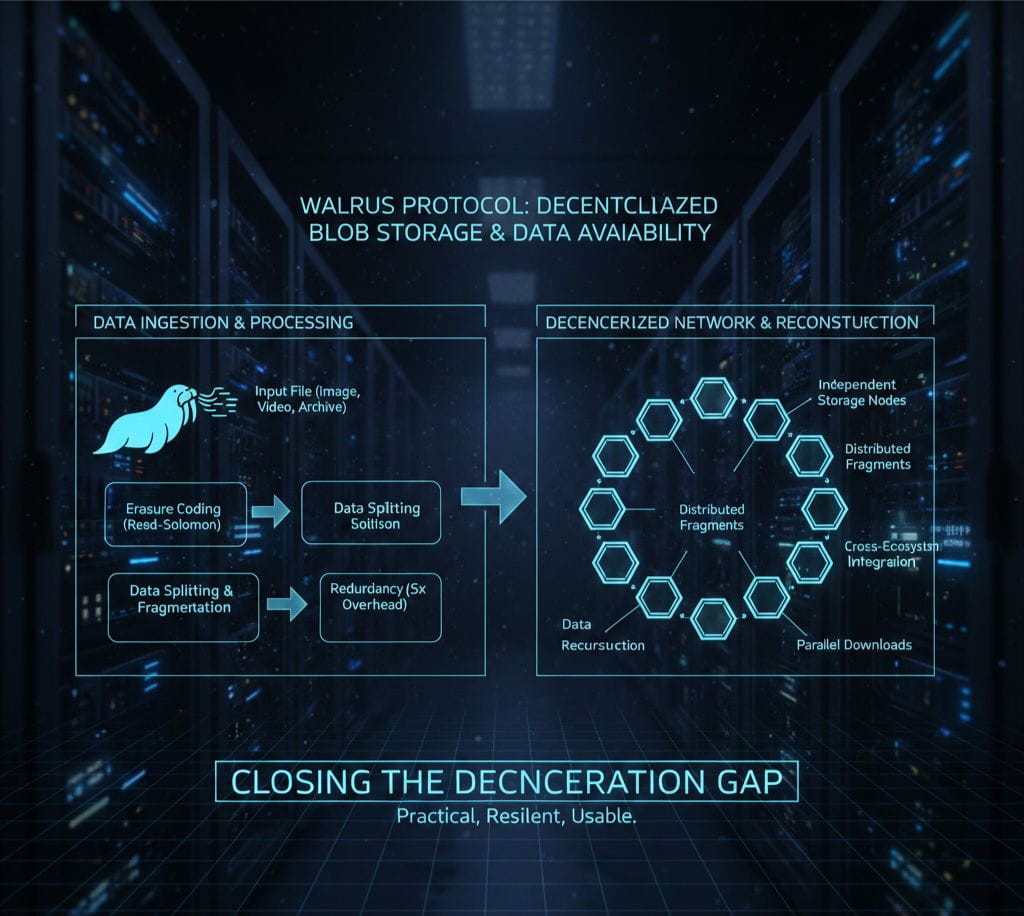 At its core, Walrus is a decentralized blob storage and data-availability network designed to handle large files images, video, archives, application data — in a way that feels usable for real products. It integrates tightly with Sui while remaining accessible from other ecosystems. Data is split using erasure coding, encoded into fragments, and distributed across independent nodes so the original file can be reconstructed even if parts of the network fail. Instead of fully replicating every file everywhere, Walrus accepts a roughly five-times storage overhead to achieve resilience more efficiently.