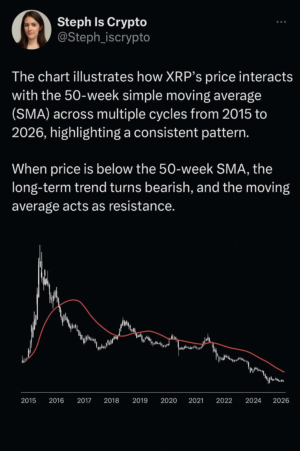Die Analyse erklärt, dass wann immer #xrp handelt unter dem 50-Wochen-SMA, signalisiert es einen Übergang zu einem bärischen langfristigen Trend, wobei der gleitende Durchschnitt als starker Widerstandslevel fungiert. $XRP Dies verstärkt die Bedeutung des 50-Wochen-SMA als kritisches Werkzeug zur Identifizierung breiterer Marktzyklen.